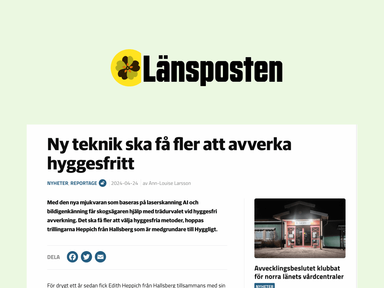 Länsposten, a newspaper in Örebro County, interviewed Edith Heppich, CEO and co‑founder of Hyggligt. She talks about how the company started, how the first harvest went, and which stands are suitable for continuous-cover forestry (hyggesfritt skogsbruk).
